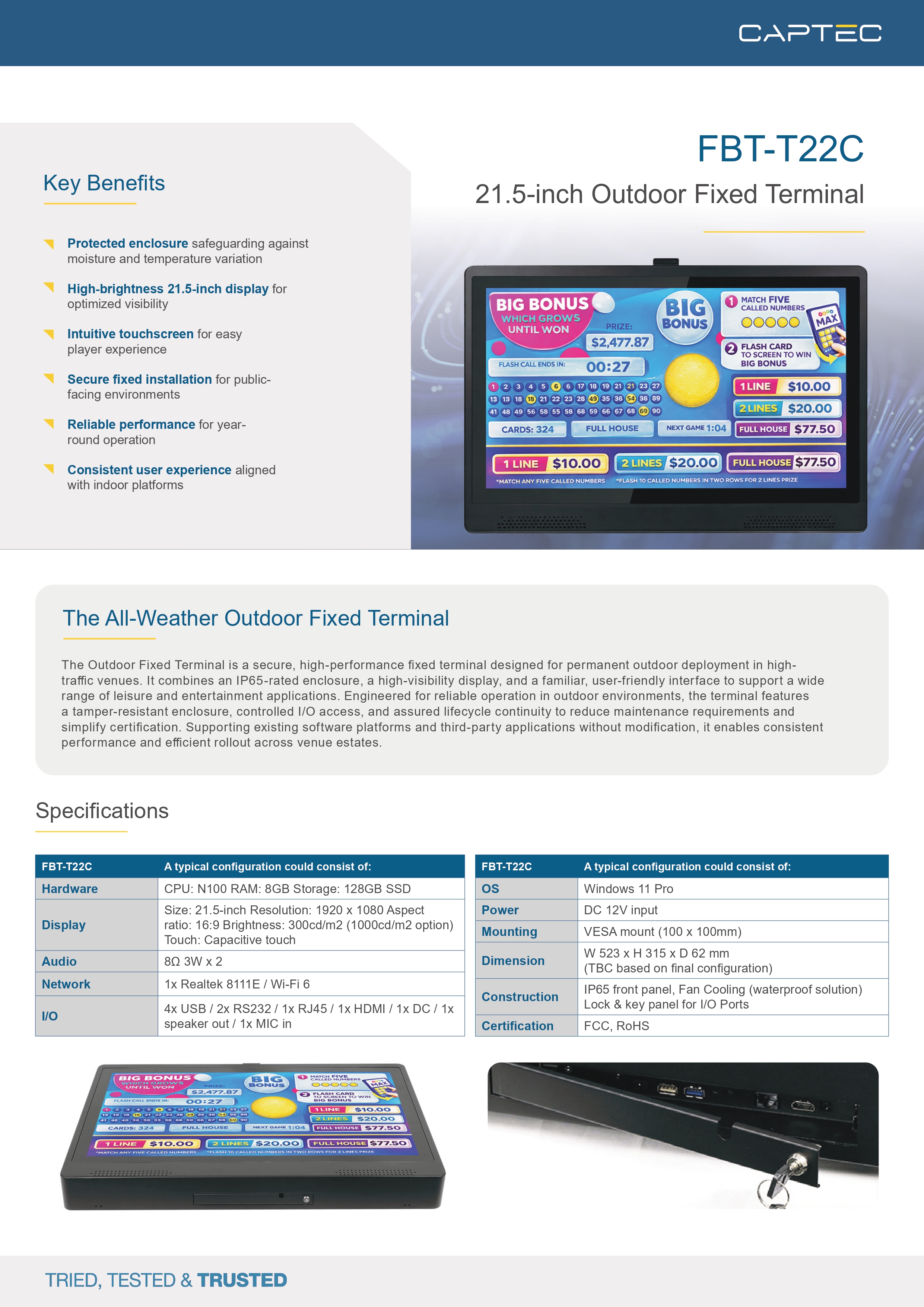 The Outdoor Fixed Terminal is a secure, high-performance fixed terminal designed for permanent outdoor deployment in hightraffic venues. It combines an IP65-rated enclosure, a high-visibility display, and a familiar, user-friendly interface to support a wide range of leisure and entertainment applications. Engineered for reliable operation in outdoor environments, the terminal features a tamper-resistant enclosure, controlled I/O access, and assured lifecycle continuity to reduce maintenance requirements and simplify certification. Supporting existing software platforms and third-party applications without modification, it enables consistent performance and efficient rollout across venue estates.