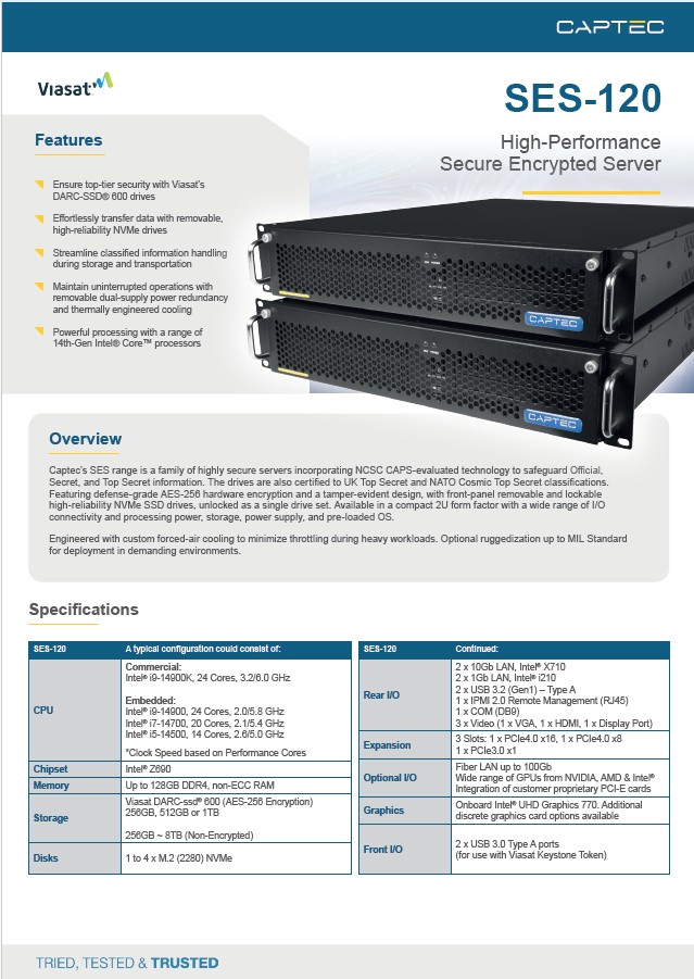 The Captec SES range is a family of highly secure servers that have been developed in close collaboration and partnership with Viasat. The SES-120 incorporates Viasat’s DARC-ssd® 600 drives, an NCSC CAPS-evaluated Data-at-Rest device which is certified up to UK Top Secret and NATO Cosmic Top Secret classifications to safeguard Official, Secret, and Top Secret data in enterprise and tactical environments, such as data stored in vehicles, aircraft, ships and forward operating bases. Each SES-120 server features 4 x Viasat DARC-ssd ® 600 NVMe™ AES-256 hardware encrypted solid state drives. The server maintains NATO Cosmic Top Secret compliance while powered on. When powered off, it is classified as NATO Unclassified, allowing the drives to be transported or handled without special security measures.